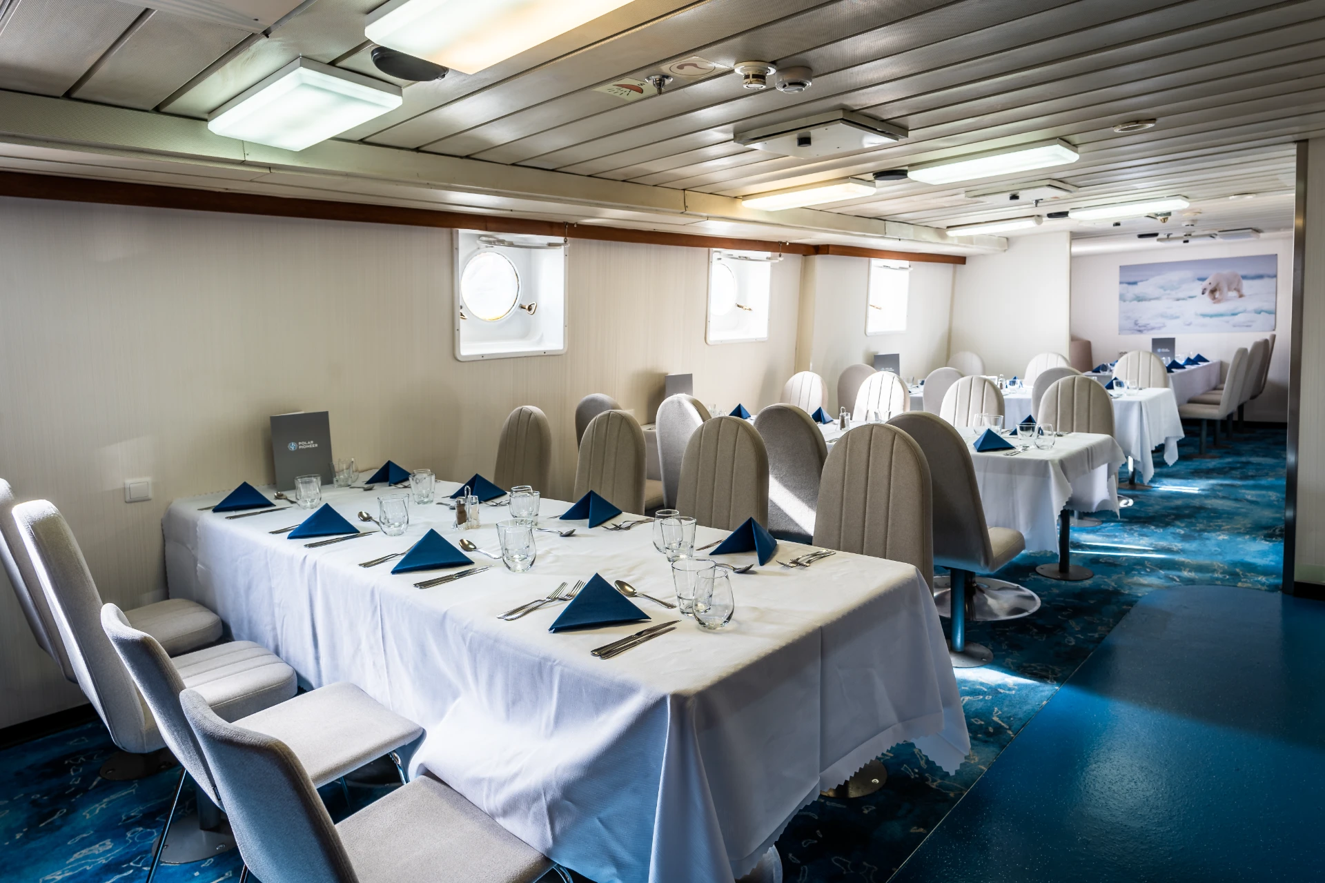 חלל אינטימי עם אירוח חמים, שבו מוגשות מנות טריות ההופכות כל ארוחה לחגיגה משותפת עם חברי המסע, בלב הקוטב הצפוני.