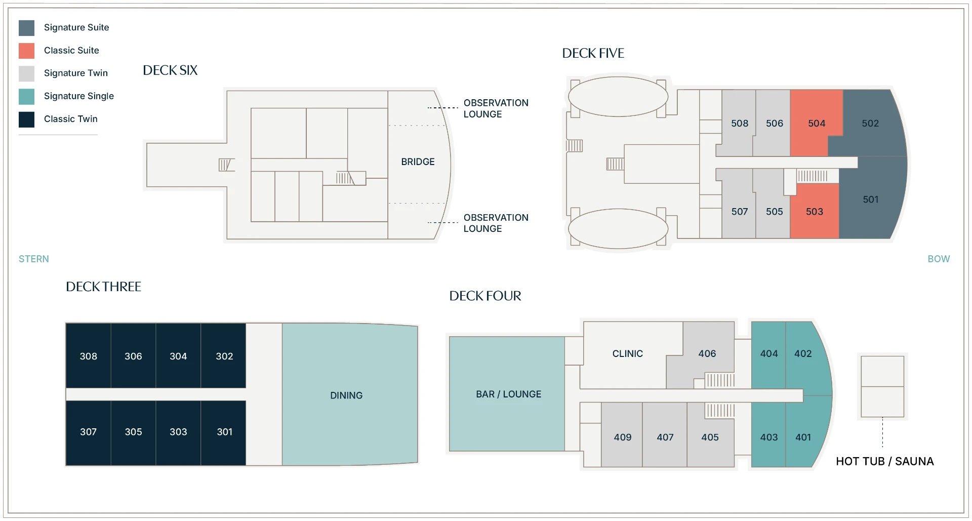 הספינה מצוידת בטרקליני תצפית על הגשר, סיפון פתוח הצופה אל נופי הקרח, לאונג' נעים להרצאות ולמפגשים, מסעדה אינטימית עם מנות טריות, וכן סאונה ואמבט חם המאפשרים להירגע מול הנופים הארקטיים.